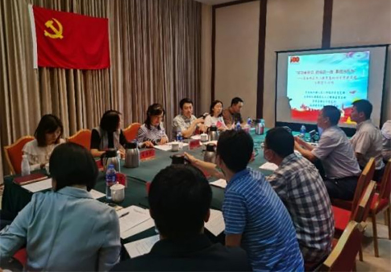 參觀后,4 個黨支部齊聚會議室,由濱海新區區委組織部高層次人才服務室黨支部書記劉建輝主持召開了座談會。宏亞公司黨支部書記岳琳領學了習近平總書記關于加強職業教育的重要指示批示精神,介紹了全國先進地區職業教育考察情況及項目進展情況。濱建投項管公司黨支部書記楊程交流了濱海新區黃港生態區職業教育產業園入園院校進展情況,劉建輝介紹了濱海新區職業教育基地建設展望。在交流研討中,宏亞公司咨詢三部部長高淑玲回答了大家比較關心的入園院校數量、政府政策支撐、資金平衡方式等方面的情況。