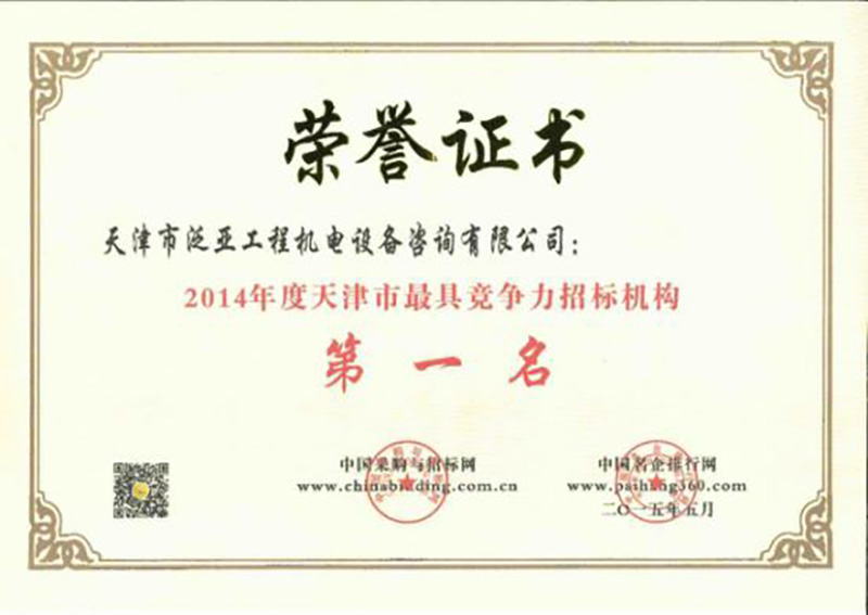 2014年度天津市最具競爭力招標(biāo)機(jī)構(gòu)第一名