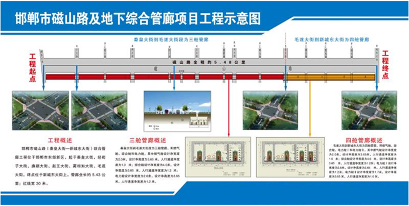 邯鄲管廊項目 更新時間:2021-09-14 點擊:1650 所屬欄目:外埠業務 邯鄲市磁山路及地下綜合管廊(秦皇大街-新城東大街)工程,邯鄲市磁山路位于邯鄲市東部地區,起于秦皇大街,經荀子大街、廉頗大街、趙王大街、藺相如大街、毛遂大街,終點位于新城東大街上,路線全長約5.48公里。投資額6.8億元 服務內容 監理